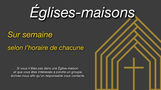 Des rencontres ont lieu durant la semaine dans les maisons, permettant d’approfondir nos relations mutuelles ainsi que notre compréhension de la Bible et son application dans la vie quotidienne. C’est l’occasion de mieux nous connaître et de nous supporter par la prière et l’entraide. Les jours et les heures des rencontres varient selon les groupes. Si vous êtes intéressés à joindre un groupe, écrivez-nous afin qu’un responsable vous contacte.
