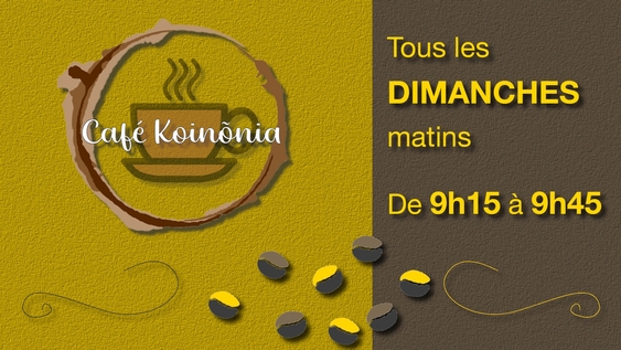 Koinõnia signifie « communion fraternelle ». Donc, avant notre célébration, dès 9h15 les dimanches matins, un temps de communion fraternelle, autour d'un bon café ou d'un bon thé, pour partager ensemble ce que le Seigneur a fait dans nos vies durant la semaine.