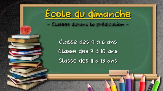Les dimanches matins, durant la prédication, les enfants de 4 à 13 ans sont regroupés selon leur âge afin de recevoir un enseignement biblique adapté à leur niveau : des chants, bricolages, histoires, discussions sont utilisés afin de les aider à mieux connaître Dieu.
